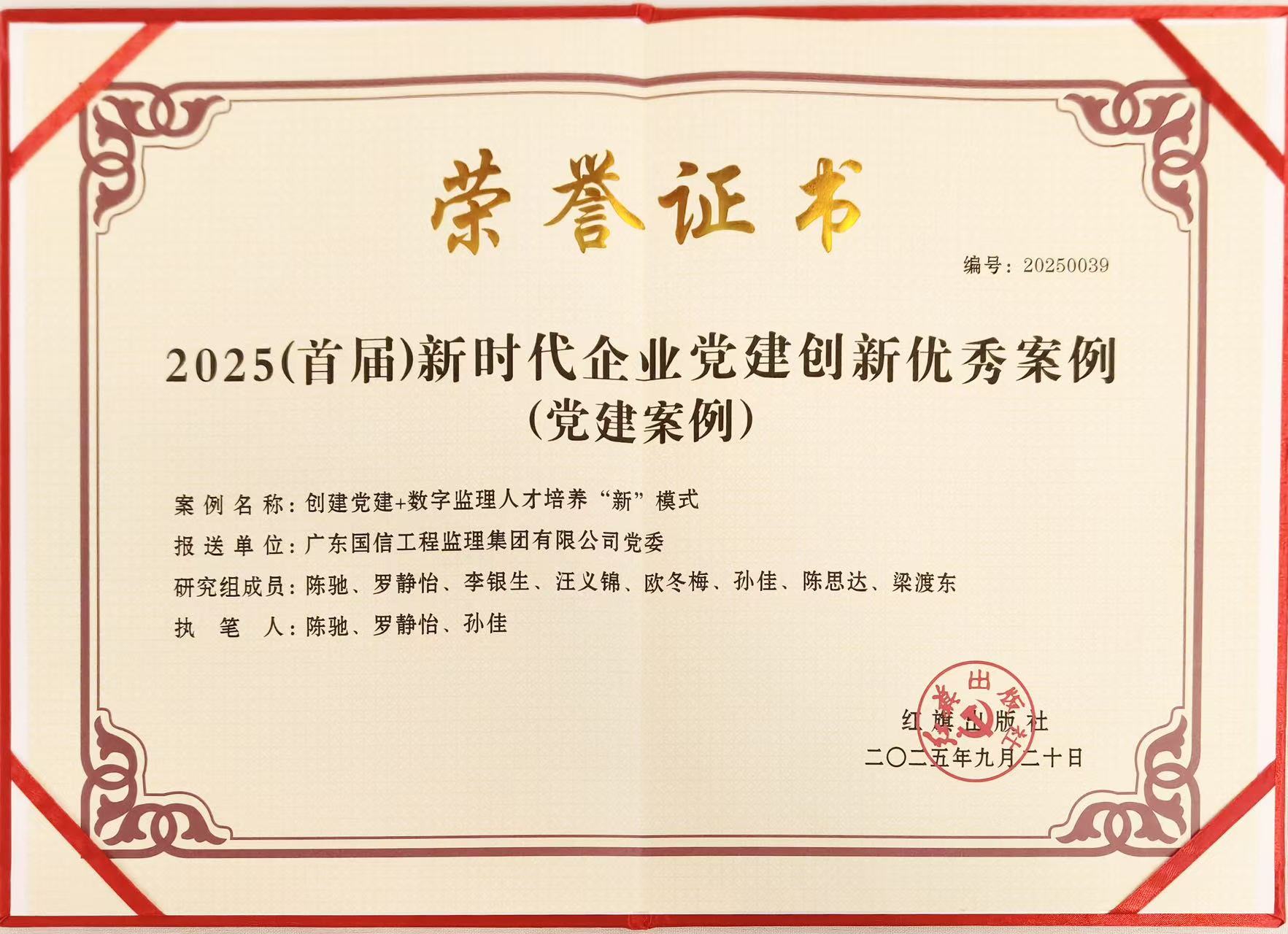 2025年9月20日,2025(首届)新时代企业党建经验交流会暨企业党建创新优秀案例发布仪式在北京成功举办。国信监理集团党建案例《创建党建+数字监理人才培养“新”模式》脱颖而出,入选“2025(首届)新时代企业党建创新优秀案例”。